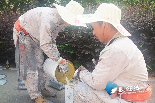 星辰在线6月16日讯(星辰全媒体记者 胡伟男)6月16日下午,行至中意路与井湾路交叉口的市民抬头就会发现,路旁的路灯顶端有工人在忙活着,他们不像挂在高枝的大熊猫那么休闲,而是在12米的高空、顶着长沙的烈日为路灯涂上“新装”。