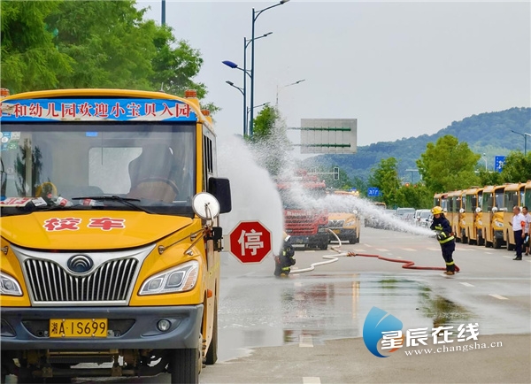 上午八点,在长郡斑马湖中学门外路口,培训人员观看了一场紧张而有序的消防救援演练。演练现场假设一辆满载学生的校车在行驶途中突然“起火”。停车后,随车照管人员立即组织学生疏散转移到安全区域。驾驶员拨打119报警,同时用车载灭火器紧急灭火。随后,消防队员赶到现场迅速灭火、破拆车辆,上车搜救被困学生并送医救护。