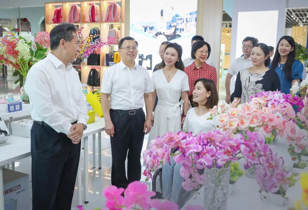 ▲商务部党组成员、部长助理任鸿斌(左一)调研出口产品集聚区