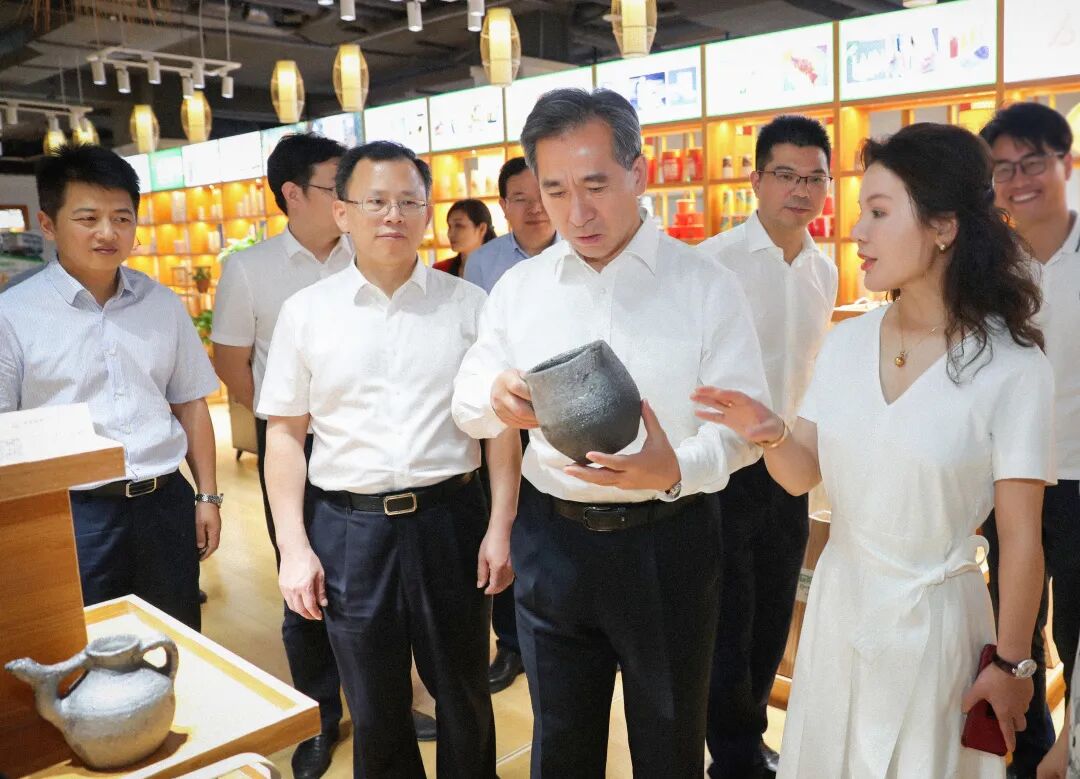 在湖南出口集聚区3楼展馆,任鸿斌一行分别考察了各展馆中的湖南特产。每到一地,他都与店长亲切交流,认真询问产品材质、制作方法和出口销售等情况。