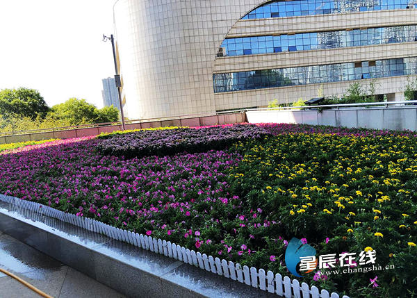 (目前,长沙高铁南站西广场落客平台上摆满了喜迎国庆的各种花卉。)