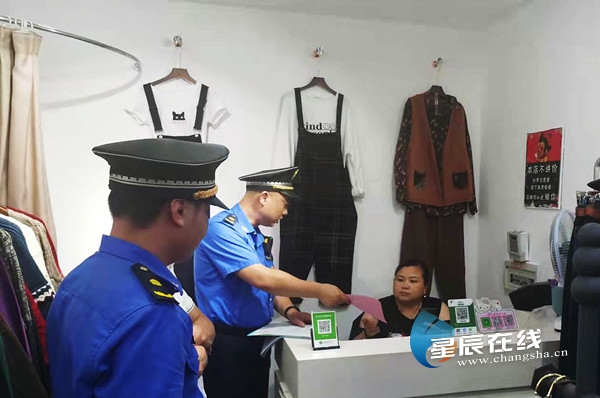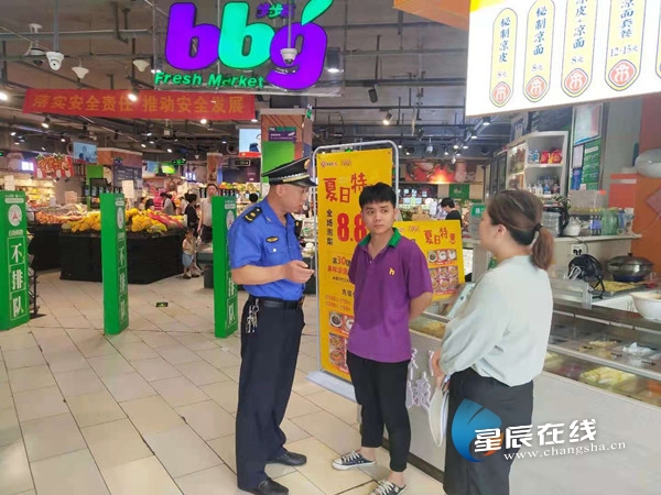 (雨花区城管执法大队候家塘中队中队长易焱<左一>向商场工作人员宣传长沙创建国家食品安全示范城市的新内容,要求经营管理方规范经营、支持创建工作。)