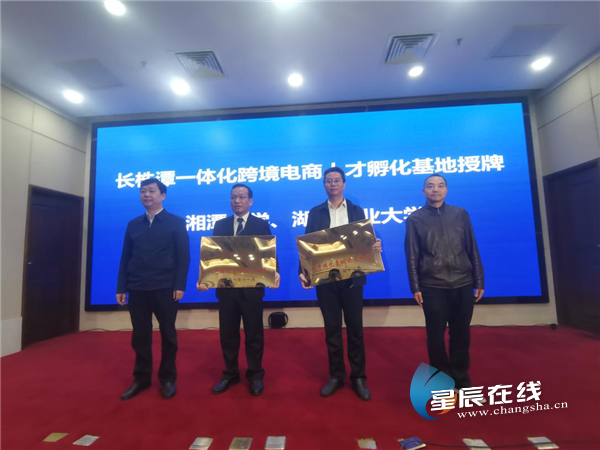 (省委组织部人才办副主任李小兵和省长株潭一体化发展事务中心创新研究部一级调研员龙文分别为湘潭大学、湖南工业大学授予了“长株潭一体化跨境电商人才孵化基地试点单位”牌匾。图片均由星辰全媒体记者 周雨晴 摄)