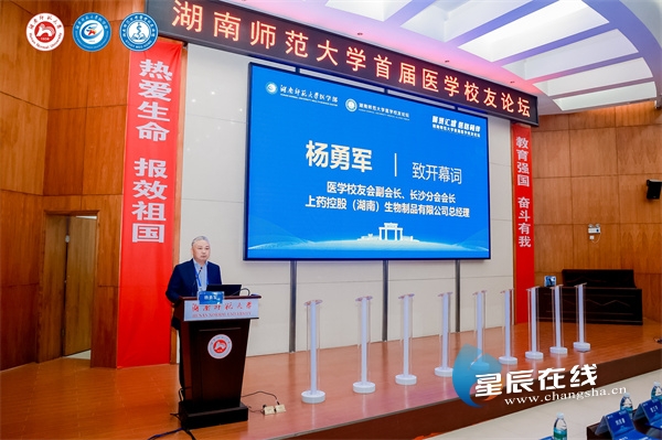 开幕式上,湖南师范大学医学校友会副会长、长沙分会会长杨勇军对校友们的归来表示热烈欢迎。他倡议全体校友携手,推动校友智慧与政府决策的“智策融合”、产业资源与临床需求的“供需融合”、校友经济与地方发展的“成长融合”,共同为“健康中国”“健康湖南”建设添砖加瓦。