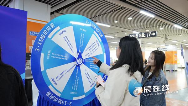列车穿行传递理念,站厅互动点燃热情。在人流最为密集的五一广场站厅,一场别开生面的“3·15维权知识大转盘挑战”吸引了大批市民参与。大家转动转盘,随机抽取关于消费权益常识、维权途径选择、消费陷阱识别等问题进行挑战。这种寓教于乐的宣传方式,打破了传统单向灌输模式,将消费者权益保护相关法律条文转化为可参与、可体验的趣味互动。现场欢声笑语不断,科学消费法治意识与共治共享维权理念正浸润市民心田,更深化了“长沙放心消费城市”的印记。