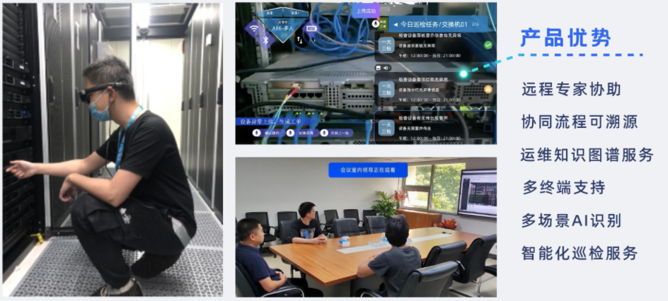 锐元AR智能巡检系统,以增强现实 (AR)穿戴设备、人工智能和自然语言处理等技术赋能一线人员更熟练的执行专家所赋予的任务,事后将处理过程、问题讨论等内容沉淀为运维知识图谱,保障高效应急处置、数据精准获取和能力经验的高效复用,帮助用户跨越空间时间界限,沉浸式、高效的完成各项工作,在智能化巡检、智能审计、物流仓储、物业管理等领域已有成熟的应用。