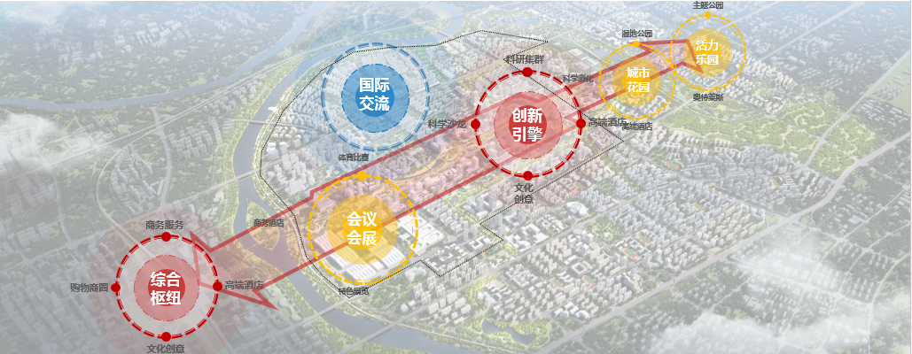 拥有6公里长城市超级中轴线,倾力打造体量超300万平方米,价值超千亿的超级CBD,以会议会展核为起点,依次形成自贸总部、国际贸易、国际交流、国际科创等四大核心组团。