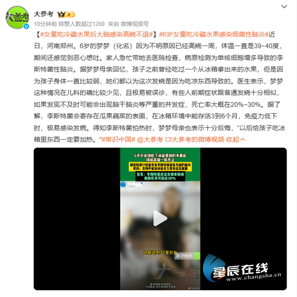 6岁女童因吃了冰箱中拿出的水果,高烧不退、恶心想吐,经病原检测确定为单核细胞增多导致的李斯特菌性脑膜炎。这种藏在冰箱里的健康杀手为何有如此大的杀伤力?10月8日,星辰在线特邀唯嘉儿科主任医师吴健美给大家科普一下李斯特菌。
