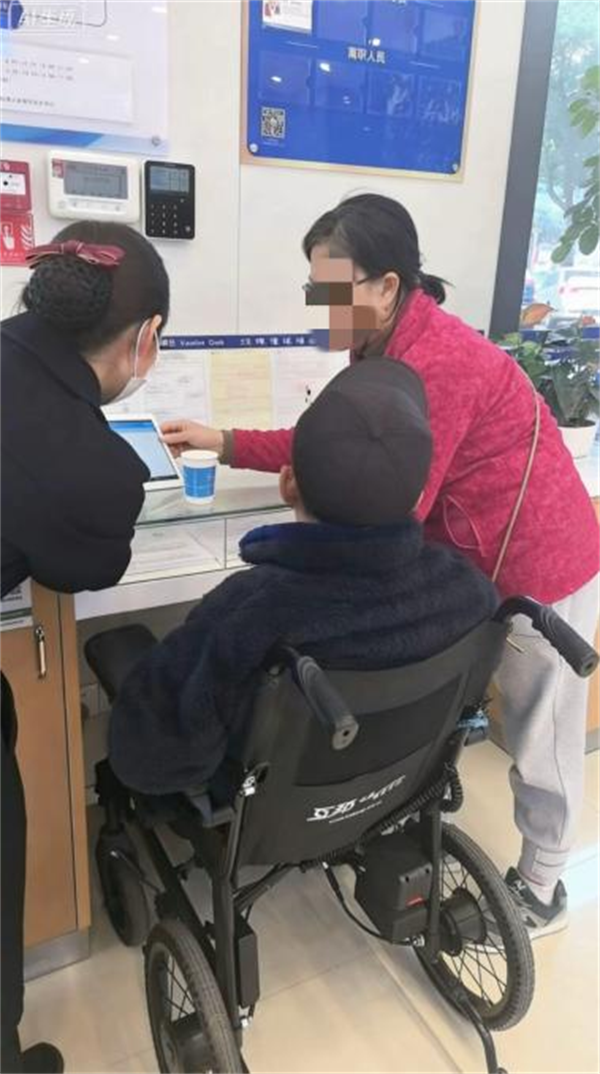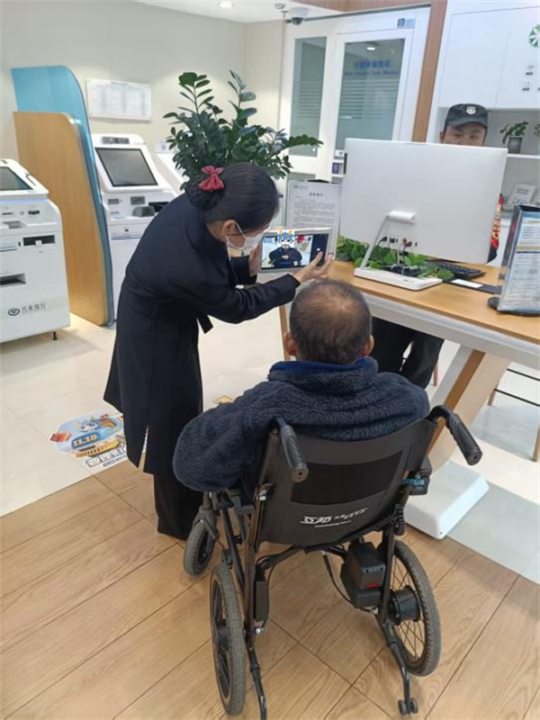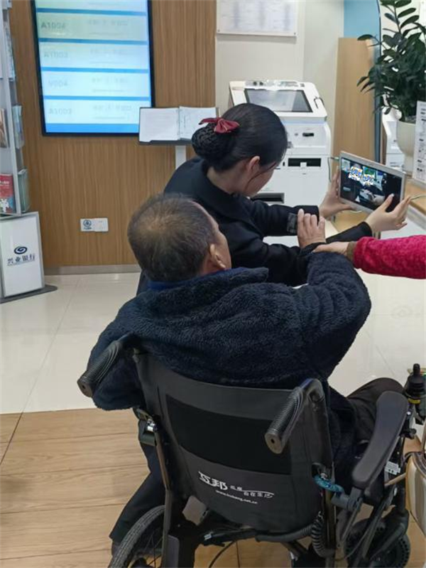 第二张照片里,一位身着浅蓝色大衣的大堂经理正半蹲在轮椅旁,膝盖压着地面,双手托着的平板稳稳当当。客户需要核对个人信息时,她将平板缓缓前倾,让老人仅需微微抬头就能看清每一行字;当老人因颤抖的手难以精准点击屏幕,她便用食指轻轻护住老人的手背。大堂的玻璃幕墙外,行道树的枯枝在风中轻摇,而这片刻的静默里,老人沙哑的“确认”声,与工作人员轻声重复的“请您再仔细看看”形成温暖的和弦。