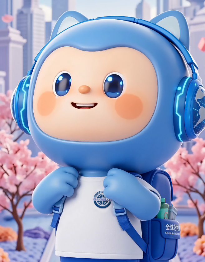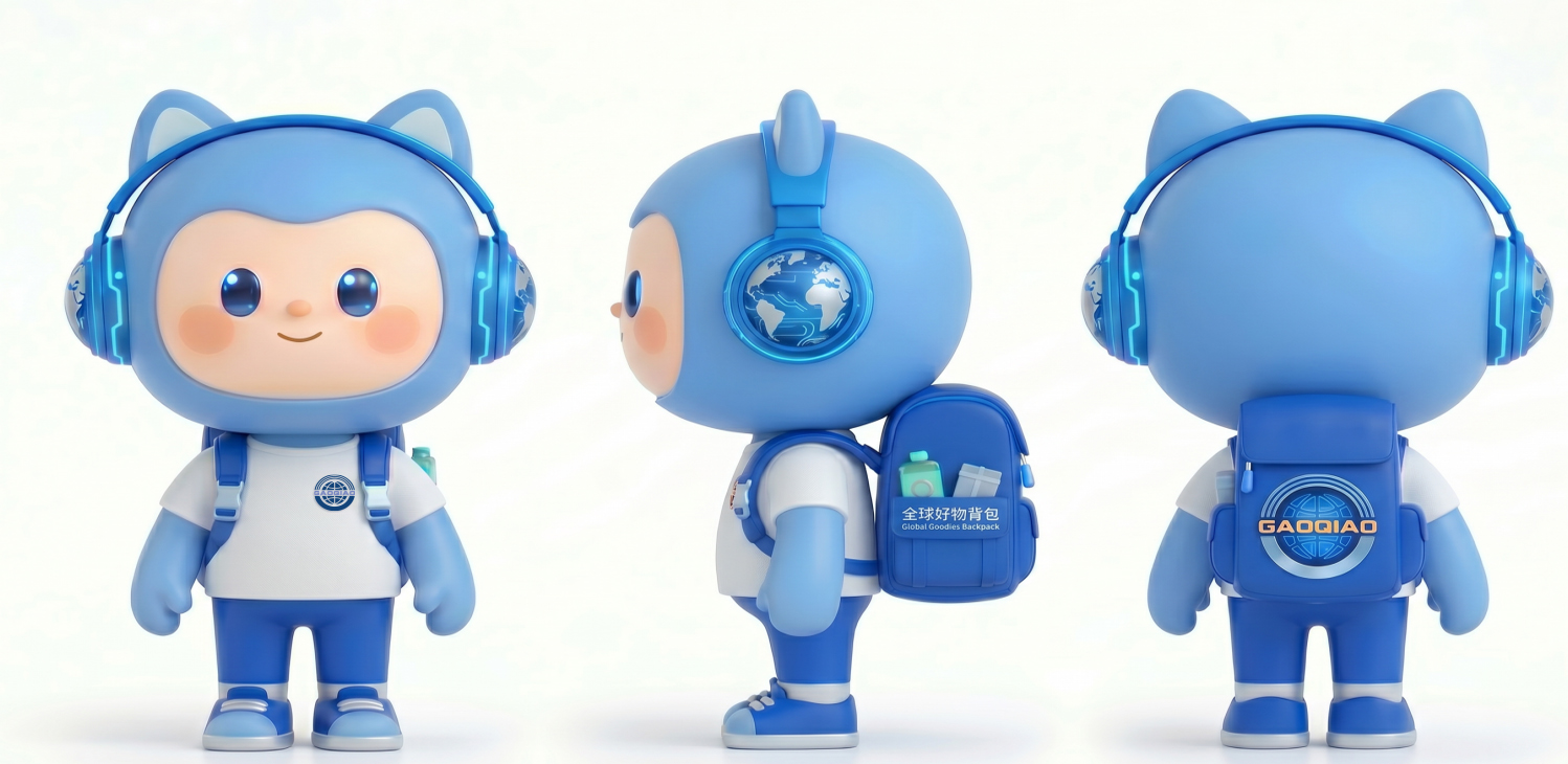 IP形象整体以晴空蓝为主色调,清爽元气、亲和治愈;头顶灵动兽耳搭配科技发光耳机,耳机内嵌地球经纬纹路,寓意高桥立足湖南、辐射全国、链接全球的广阔商贸网络;
