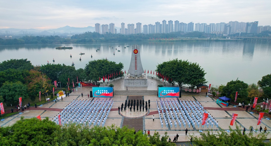 赣州持续擦亮长征品牌,传承红色基因,赓续红色血脉,从长征精神中汲取奋进力量。图为2023年12月9日中国红色旅游博览会在于都开幕时,一群青少年在中央红军长征出发纪念碑前诵读《可爱的中国》。(资料图片)记者邹忠辉 摄