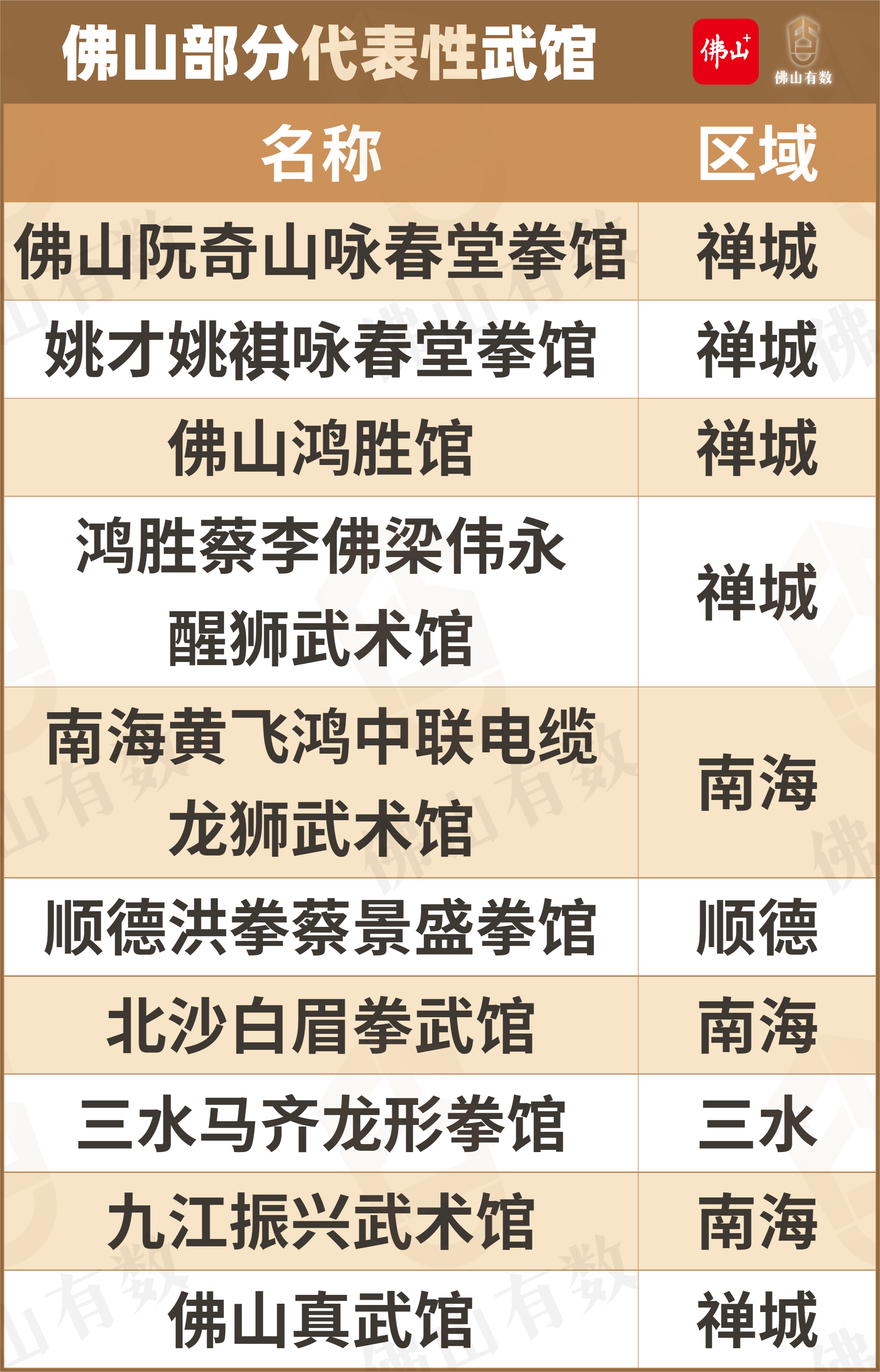 武馆、功夫角遍布佛山的大街小巷,佛山阮奇山咏春堂拳馆、佛山鸿胜馆等一批武馆仍在招收弟子,习武之人随处可见,不同门派的武者们齐聚佛山,弘扬武术文化。