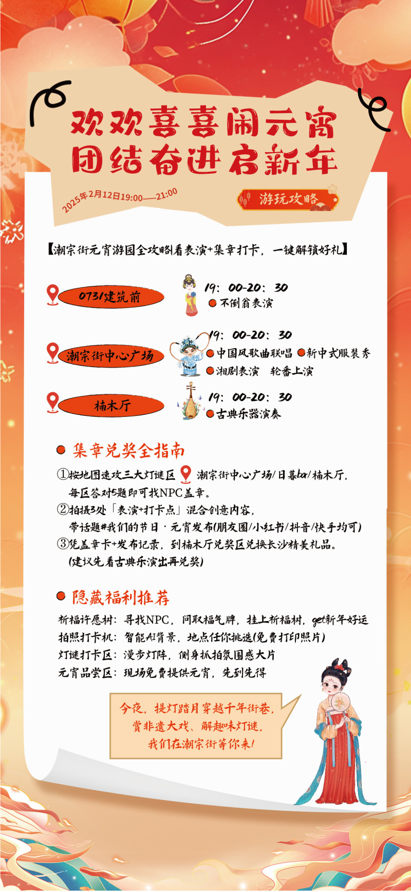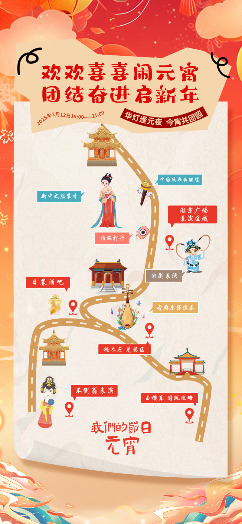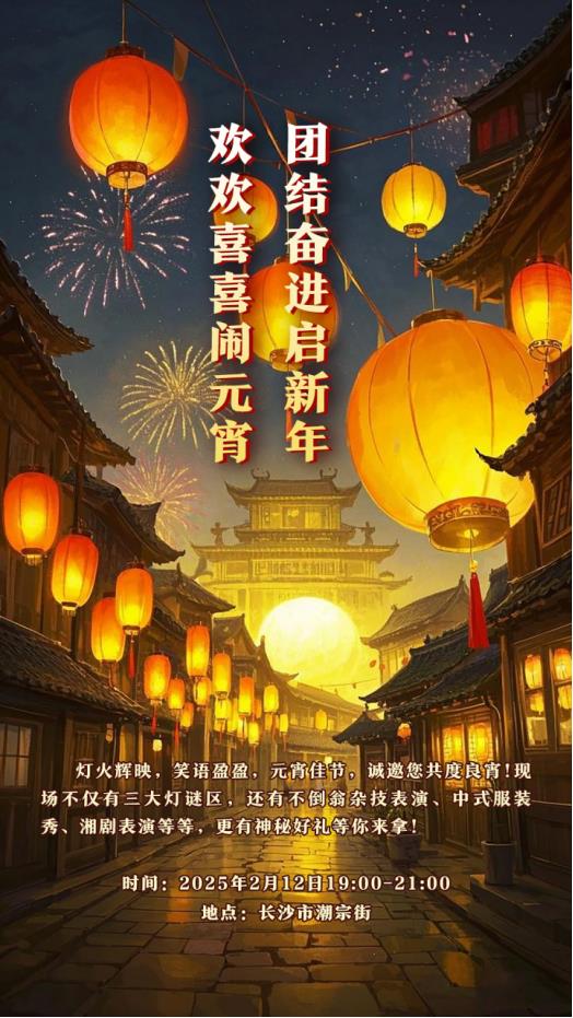 活动由长沙市文明办、长沙晚报社和开福区委宣传部(区文明办)联合主办,主题为“欢欢喜喜闹元宵 团结奋进启新年”。欢迎广大市民12日晚前往潮宗街参加元宵游园会,共赴一场特别的国风盛宴。