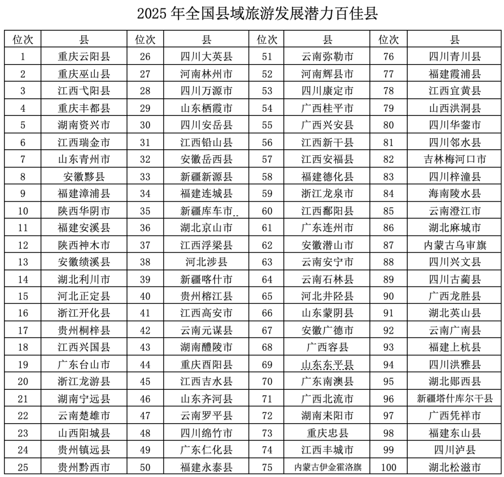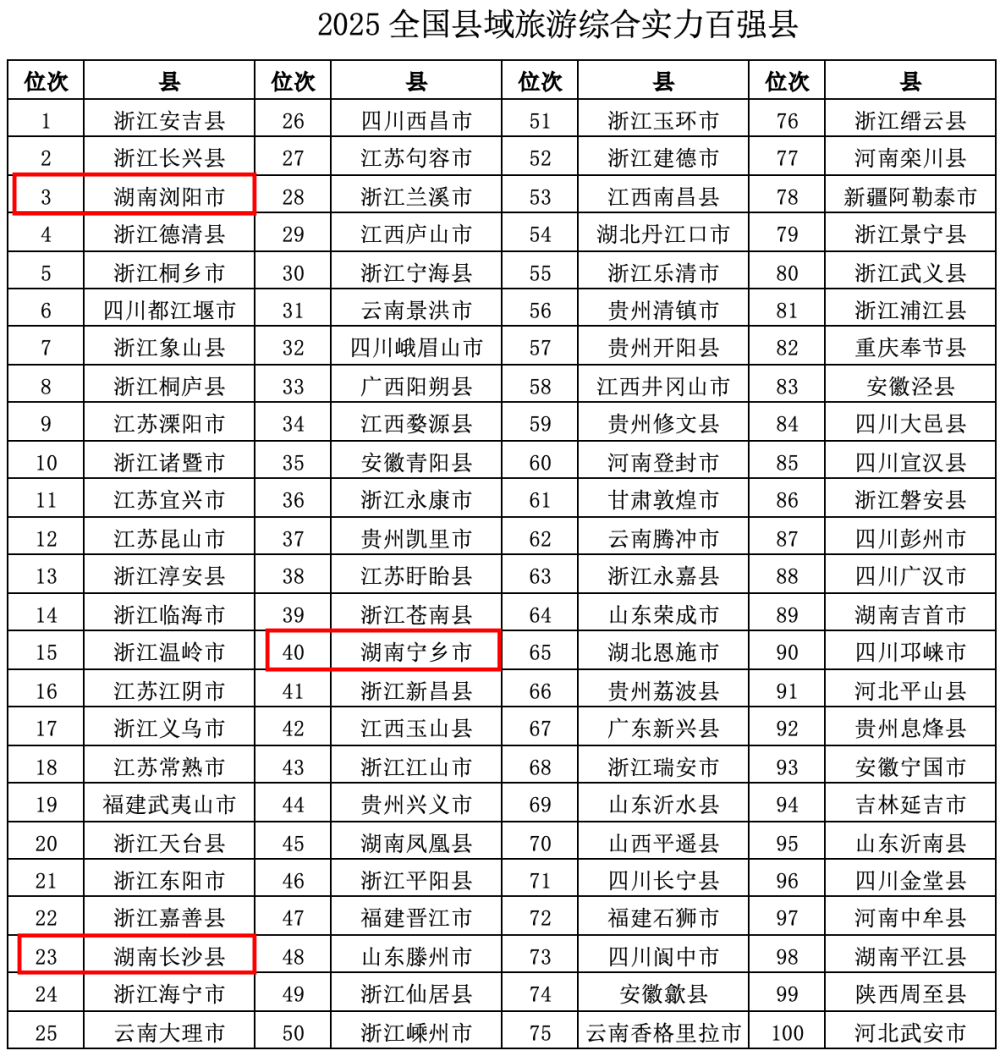 报告对全国1866个县域的旅游发展状况进行了系统评估,并发布了全国县域旅游综合实力百强县、发展潜力百佳县、发展最快的100个县榜单。浏阳市、长沙县、宁乡市上榜全国县域旅游综合实力百强县名单,其中浏阳市位列全国第3。