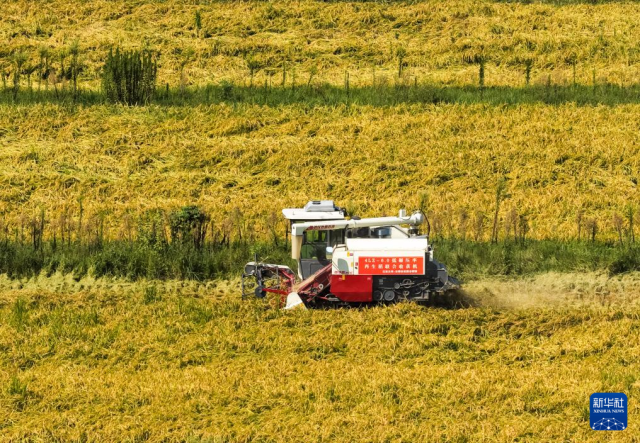 8月22日,在湖南省邵阳市隆回县司门前镇石山湾村,农民驾驶农机收割稻谷(无人机照片)。
