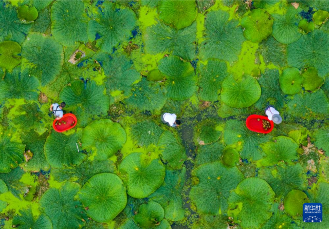 8月22日,农民在江苏省靖江市东兴镇惠圣村采收芡实(无人机照片)。