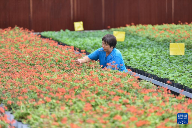 8月22日,在山东省青州市黄楼街道东建德村,农民在管护花卉。