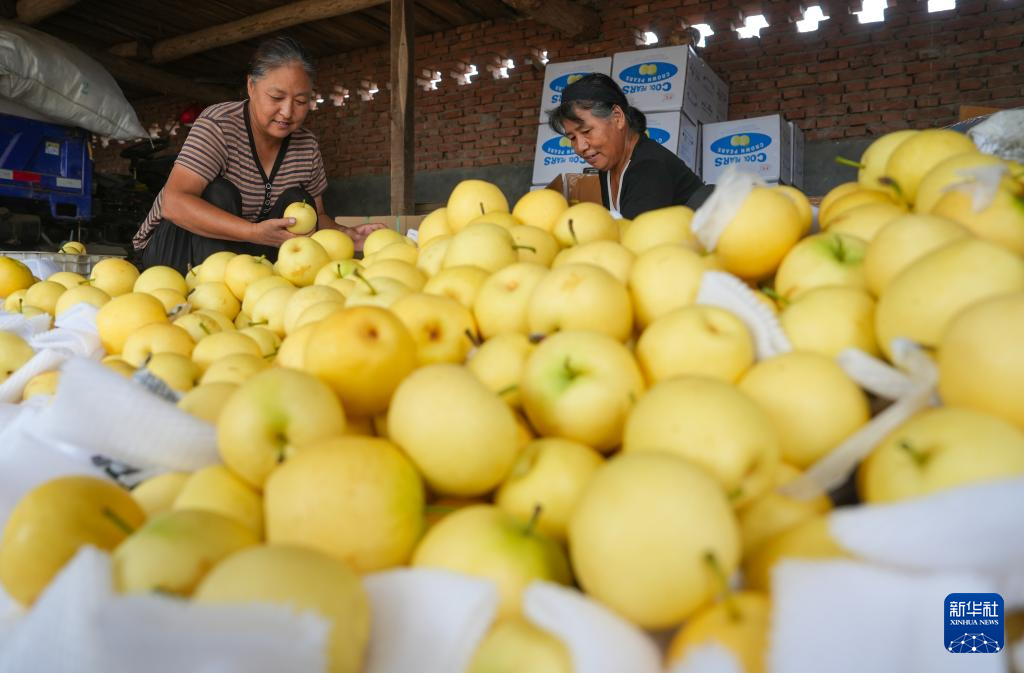 8月22日,在河北省石家庄晋州市周家庄乡,果农将采收的鲜梨分拣装箱。