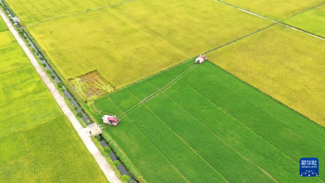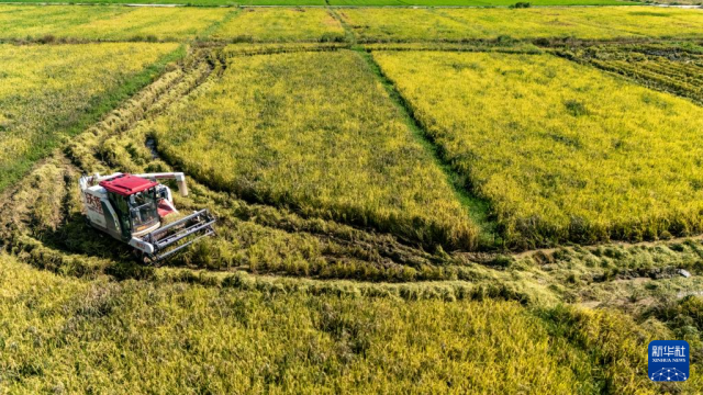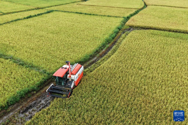 8月22日,在湖南省永州市道县营江街道,农机手驾驶机械收割水稻(无人机照片)。