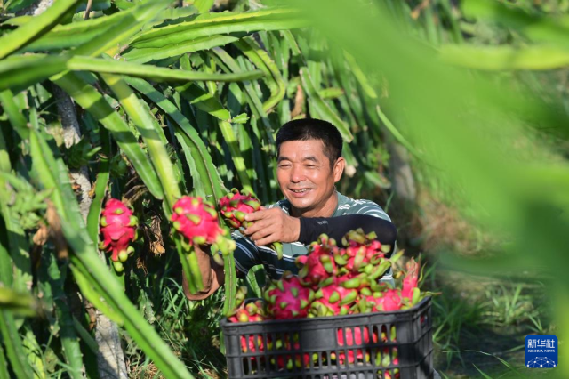 8月22日,在江西省宜春市万载县康乐街道里泉村火龙果基地,果农在采收成熟的火龙果。