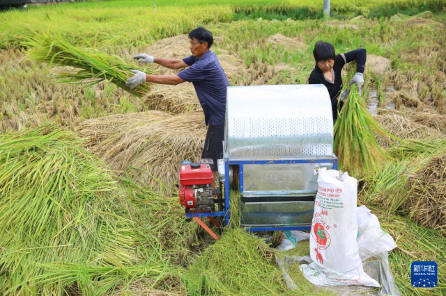8月22日,在湖南省邵阳市隆回县羊古坳镇,农民使用脱粒机脱粒。