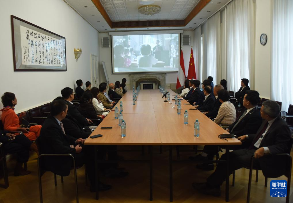 10月25日,在位于奥地利维也纳的中国驻奥地利大使馆,与会人员观看《台湾1945》纪录片。新华社记者 贺灿铃 摄