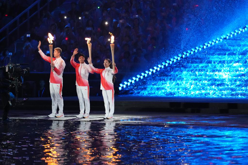11月9日,在第十五届全国运动会开幕式上,火炬手苏炳添(中)、张家朗(左)、李祎点燃主火炬后向观众致意。新华社记者肖艺九摄