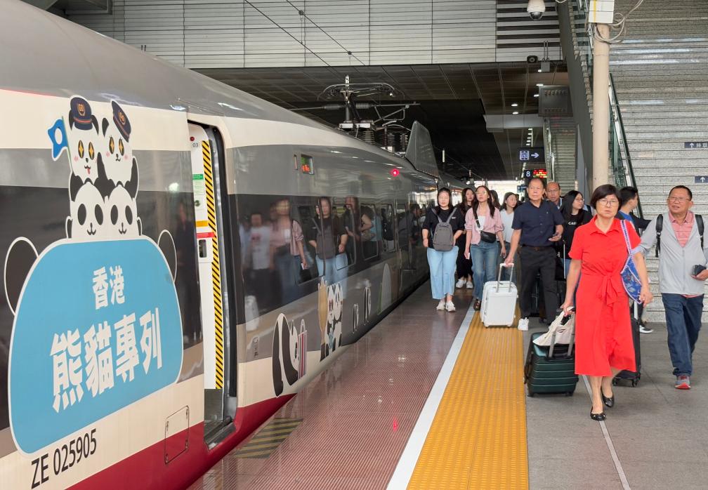 4月27日,往返深港的高铁列车停靠在深圳北站站台。新华社发