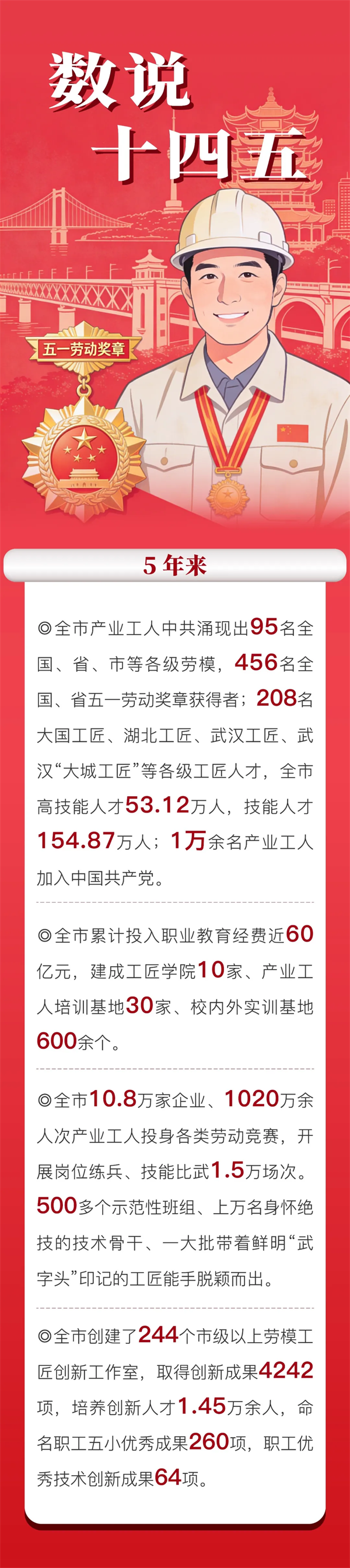 通过劳动和技能竞赛,500多个示范性班组、上万名身怀绝技的技术骨干、一大批带着鲜明“武字头”印记的工匠能手脱颖而出。产业工人这支主力军团,用最朴实的劳动创造了最真实的财富,夯实了武汉作为经济重镇最雄厚的实力根基。